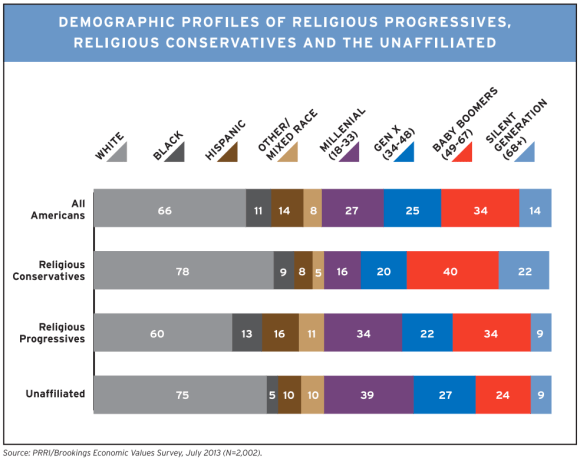 Blacks, hispanics, and people of mixed race are all more likely to be religious progressives than conservatives; these groups are also among the fastest-growing demographics in the United States. Similarly, Millennials are more than twice as likely to be religious progressives than religious conservatives; in fact, people older than 50 make up more than 60 percent of those who are considered to be religious conservatives. Although it’s impossible to talk to an 18-year-old about her views on culture and predict what she’ll think in two decades, these demographic trends suggest that the religious right is about to start shrinking.
