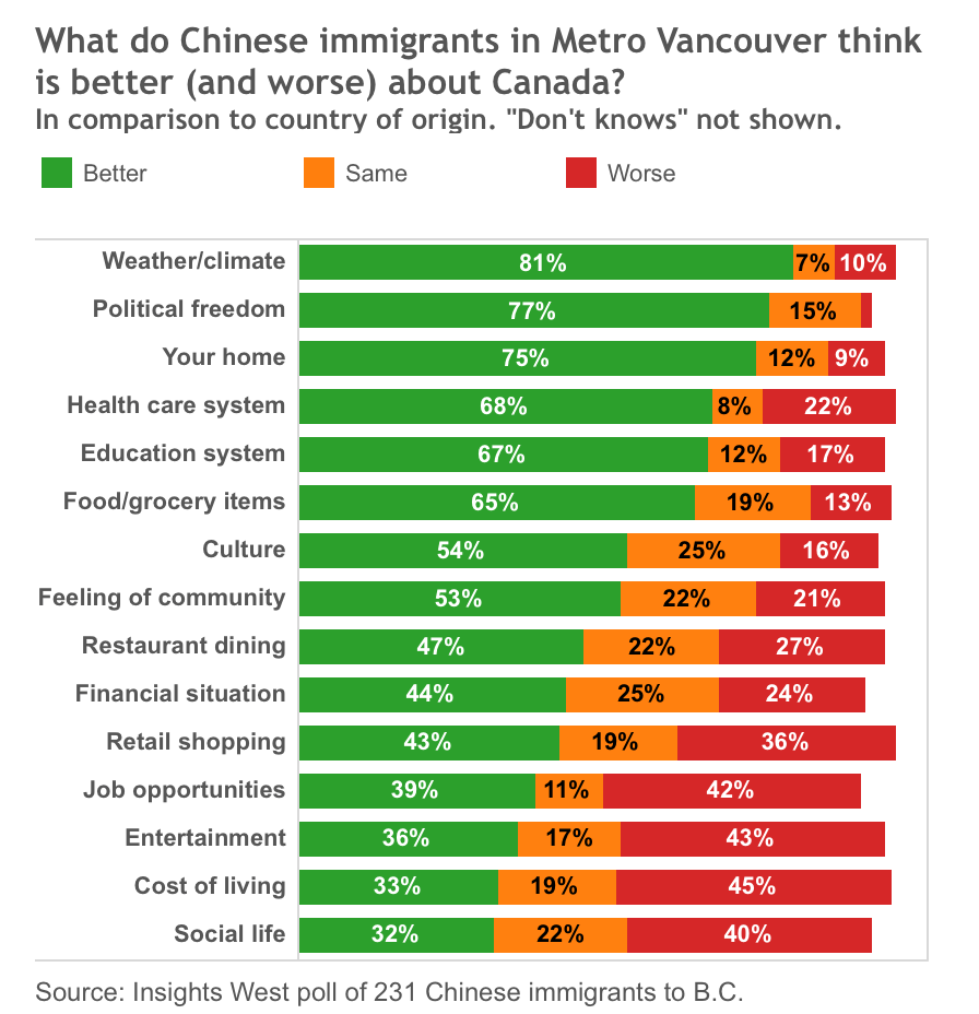 The survey found Chinese immigrants are very happy with their level of political freedom in Canada, with 77 per cent saying it’s better here and only two per cent saying it’s worse. They also like the weather, with 81 per cent saying the climate here is better than where they came from. And government services get a thumbs up, with 68 per cent saying Canada’s health care system is better and 67 per cent preferring our education system.