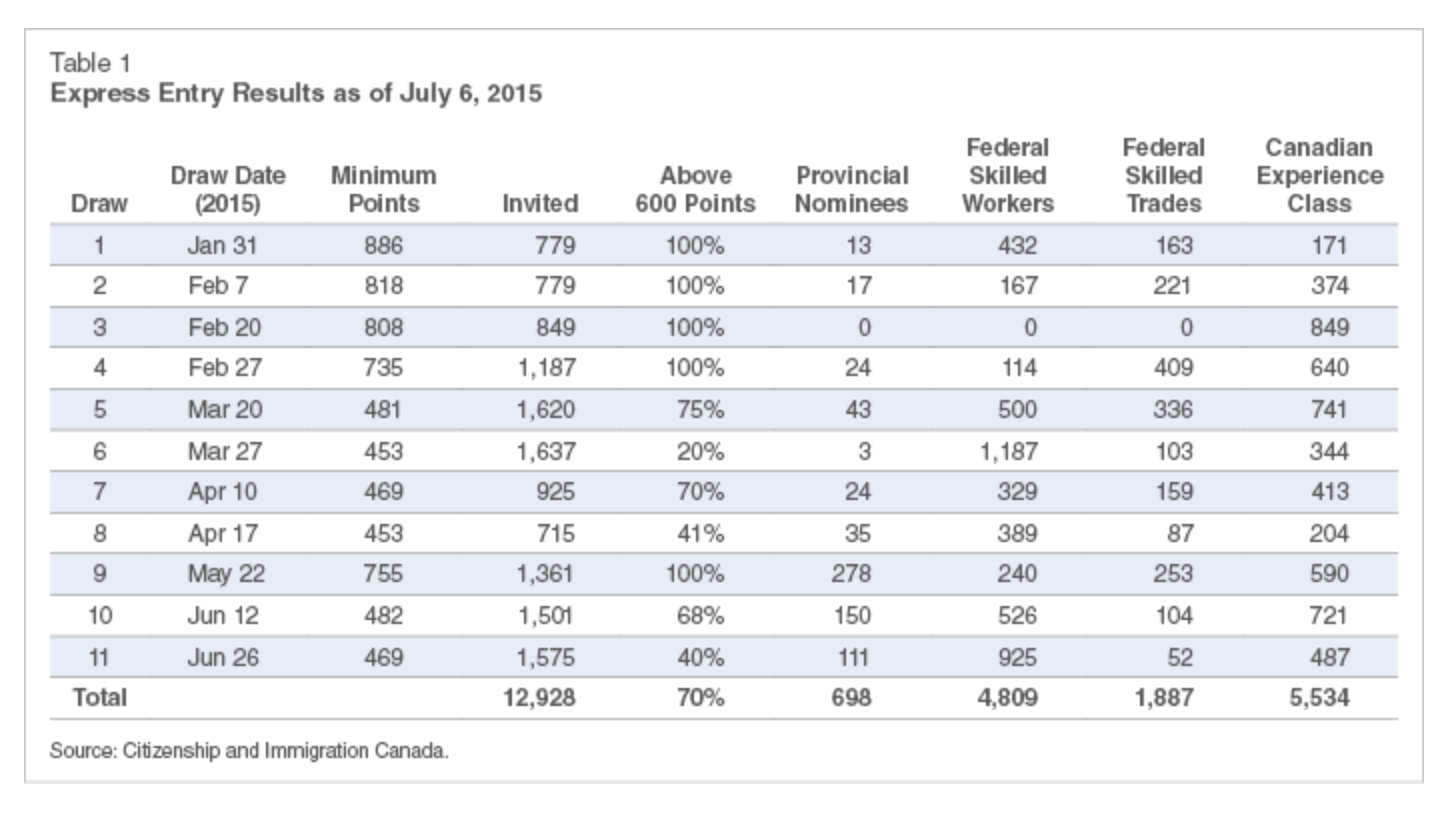 As of July 6, 2015, 112,701 Express Entry profiles had been submitted. Of these profiles, 48,723 candidates (43 per cent) were found ineligible since they did not meet Express Entry criteria. Of the remainder, 12,928 received invitations to apply for permanent resident status (in eleven draws which took place January 1–July 6: See Table 1). Among the invited candidates, 70 per cent scored above 600 points, meaning that the majority either obtained a job offer backed by a Labour Market Impact Assessment (LMIA),3 or a Provincial Nomination Program (PNP) certificate.4 Scoring over 600 points was a prerequisite to receiving an invitation to apply in Express Entry’s first four draws. Since then, point requirements have declined, though never below 453 points.