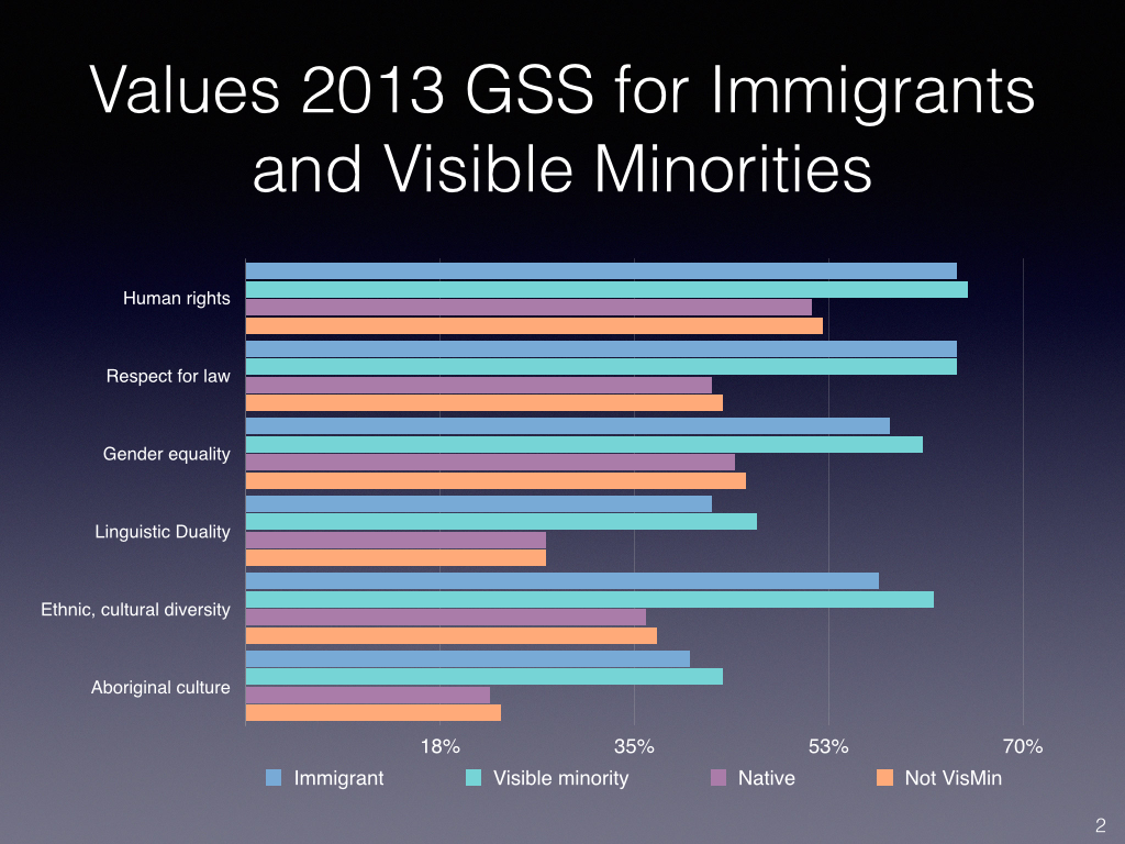 Interesting findings from the General Social Survey. For the charts, I have focussed on the contrast between immigrants (first generation) and the native-born and visible minorities (multiple generations but the vast majority first generation) and non-visible minorities.