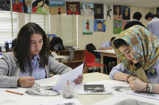 Two talented young artists — Stefany Novoa (left), 16, and Frishta Wassl, 14 — work on self-portraits in Christine Wilkin’s art class.