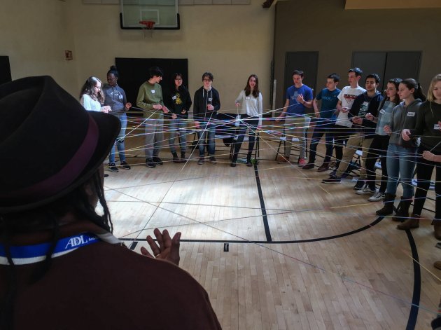 “Ok, folks! Showtime!” bellows the ADL’s New England Senior Training Consultant Rob Jones from the front of a gymnasium. His dreadlocks swinging out from under a felt fedora, Jones bounces around the circle of students, grilling them on what they’ve learned from the exercises they’ve done so far and getting them ready to be leaders instead of participants. They begin by practicing how they will introduce themselves to classmates when they run a workshop.