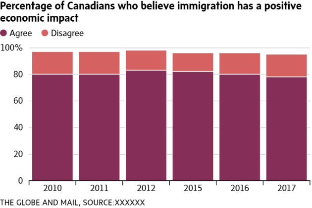 Canadians’ sentiment towards immigration hasn’t wavered in the past six months, with eight in 10 people still agreeing that immigrants benefit the economy, a national survey released exclusively to The Globe and Mail shows.