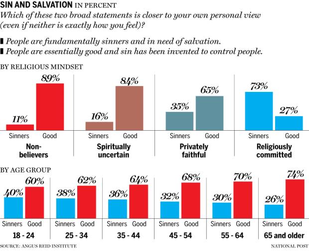 Two-thirds of those polled sided with the essential goodness of people. But among the religiously committed – who made up about one-fifth of the survey group – 73 per cent said people are fundamentally sinners.