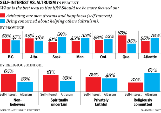 “Caring for others versus personal fulfillment, those are two very different value constructs,” Angus Reid, the institute’s founder and chairman, said in an interview. “And the relationship between them and religiosity is really significant.”