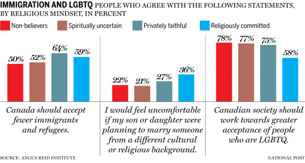 But that compassion has its limits. The 2,006 Canadian adults surveyed were asked a series of moral questions. The responses showed that the two groups on the religious end of the spectrum – the religiously committed and privately faithful – were together the most likely to say:
