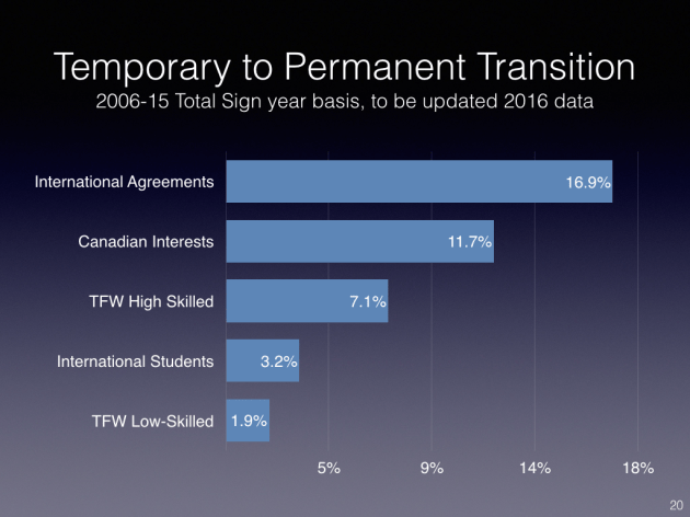 Over the 2000s, immigration to Canada was increasingly drawn from TFWs. For instance, the proportion of newly landed adult immigrant men already holding a job in Canada rose from 16.3% in 1999 to 28.9% in 2010. Most of this increase consisted of immigrants who had high-paying jobs in Canada before attaining permanent resident status.