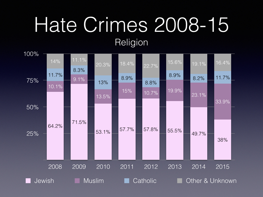 Lastly, this chart shows how religiously-motivate hate crimes have shifted, with the increase of hate crimes against Muslims notable:
