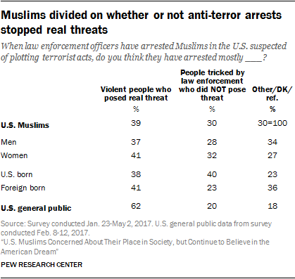 Muslim Americans also differ from the general public in their views on undercover sting operations and other police efforts to disrupt terrorist plots. Four-in-ten U.S. Muslims (39%) say that when law enforcement officers have arrested Muslims on suspicion of plotting terrorist acts, they have mostly arrested “violent people who posed a real threat.” But 30% say such arrests have mostly involved “people who were tricked by law enforcement and did not pose a real threat,” while an additional 30% say they are not sure or express no opinion.