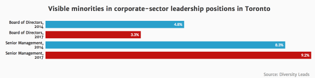 Visible minorities make up more than half of Toronto’s population, but only 3.3 per cent of corporate boards and 9.2 per cent of the private sector’s senior management, a new study finds.