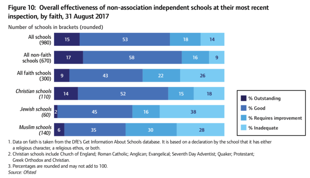 The Ofsted report detailed its recent inspections of private faith schools, with 26% rated inadequate and 22% as requiring improvement – Ofsted’s two lowest categories.