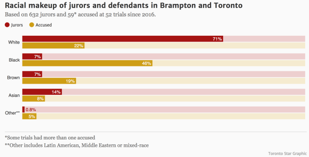 Seventy-one per cent of the 632 documented jurors were white in cities where more than half the population identifies as non-white (In Toronto, 51.4 per cent of residents identify as visible minorities; in Brampton, the figure is 73.3 per cent).