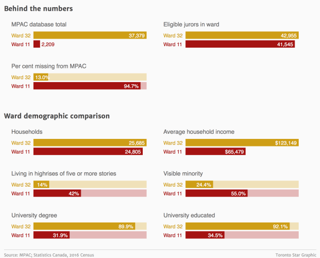 The Toronto Star compared City of Toronto ward demographics for voting-age adults with ward data provided by the Municipal Property Assessment Corporation from its list of eligible voters — the same list that serves as a starting point for the selection of jurors.