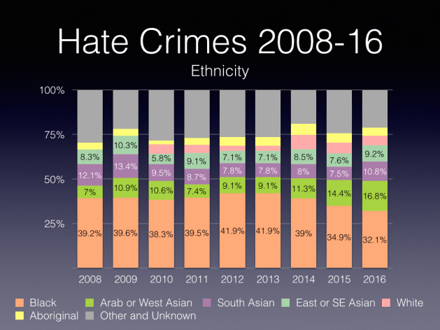 - Between 2015 and 2016, the number of police-reported crimes motivated by hatred of a race or ethnicity increased 4% (from 641 to 666). In all, 48% of all police-reported hate crimes in 2016 were motivated by hatred of a race or ethnicity. Much of this increase was a result of more hate crimes targeting South Asians (+24 incidents) and Arabs and West Asians (+20 incidents). Despite posting a decrease in 2016, crimes targeting Black populations remained one of the most common types of hate crimes (15% of all hate crimes).