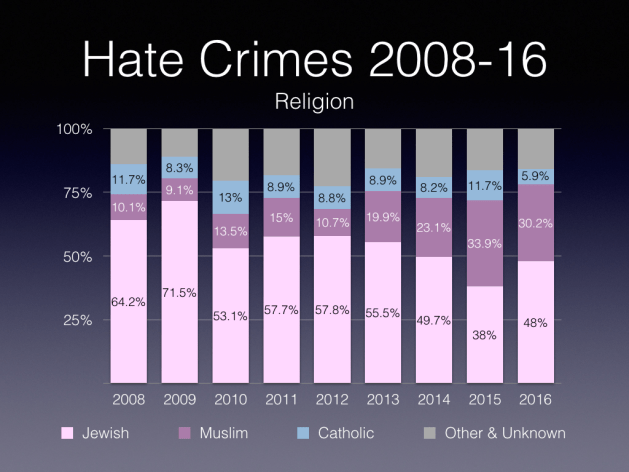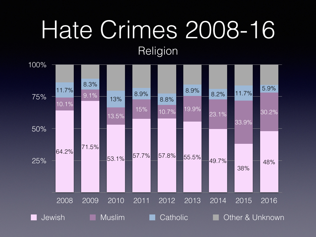 - Overall, 33% of hate crimes reported in 2016 were motivated by hatred of religion. Compared with 2015, the number of hate crimes motivated by religion decreased 2% in 2016 (from 469 in 2015 to 460 in 2016). Police-reported crimes motivated by hate against the Jewish population rose from 178 incidents in 2015 to 221 incidents in 2016 (+24%). In contrast, the number of crimes targeting the Catholic population fell from 55 to 27 incidents. Similarly, crimes targeting the Muslim population decreased 13% (from 159 incidents in 2015 to 139 incidents in 2016).