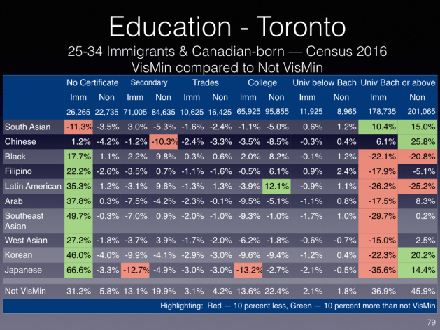 The following three charts illustrate this, looking at the highest level of education attainment for 25-34 year olds, or later than the high school data that she cites (i.e., the social and economic outcomes that reflect, in part, high school outcomes). The first looks at the university graduation rates for visible minorities, immigrant and non-immigrant (Canadian-born) compared to not visible minorities, the second provides a breakdown of the highest level of educational achievement for Toronto (I have done the same for the other cities) and the third looks at median employment income for university graduates: