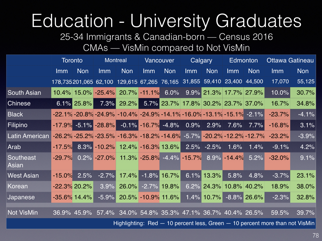 The following three charts illustrate this, looking at the highest level of education attainment for 25-34 year olds, or later than the high school data that she cites (i.e., the social and economic outcomes that reflect, in part, high school outcomes). The first looks at the university graduation rates for visible minorities, immigrant and non-immigrant (Canadian-born) compared to not visible minorities, the second provides a breakdown of the highest level of educational achievement for Toronto (I have done the same for the other cities) and the third looks at median employment income for university graduates: