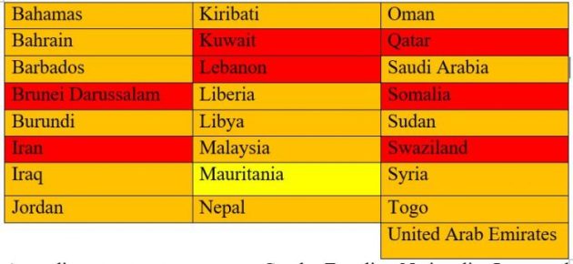 The table below uses a color scheme to divide the laws of the 25 countries into three categories. The laws of the first group of countries (red) have nationality laws which do not allow mothers to confer their nationality on their children with no, or very limited exceptions. These laws create the greatest risk of statelessness. The laws of the second group of countries (orange) have made some exceptions for mothers to confer nationality if the father is unknown or stateless. The laws of the third group of countries (yellow) also limit the conferral of nationality by women but additional guarantees ensure that statelessness will only arise in very few circumstances.