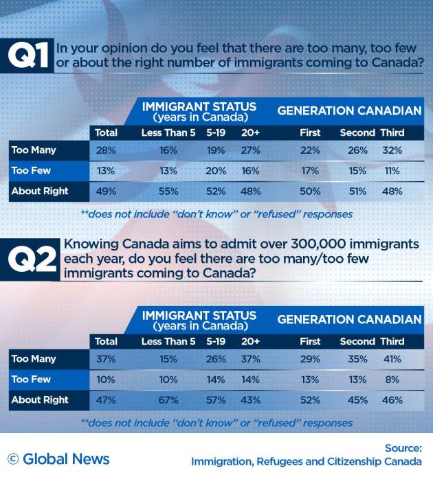 “Knowing Canada aims to admit over 300,000 immigrants each year, do you feel there are too many/too few immigrants coming to Canada?” the questionnaire conducted for the report asked.