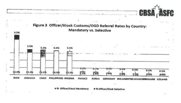 The CBSA analysis found that the rates at which travellers were referred to secondary inspection differed wildly depending on their countries of origin.