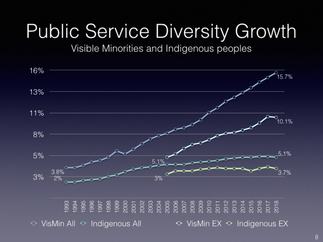 My updated charts reflecting the latest government EE report. Most noteworthy is the small downtick in visible minority and Indigenous executive numbers.