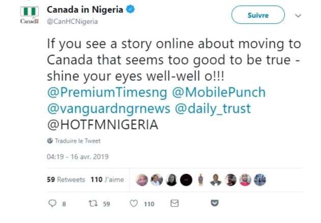 The High Commission of Canada in Nigeria had to debunk false news about immigration circulating there. This tweet uses a Nigerian expression, “Shine your eyes,” which means ‘be careful’ or ‘be vigilant’. (Twitter)