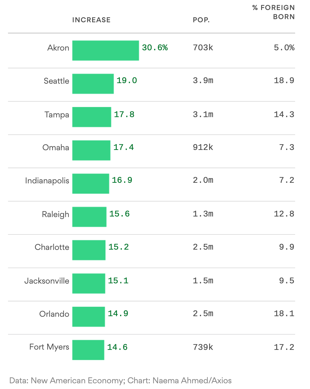 Why it matters: From 2014-2017, immigrants contributed nearly 33% of the total population growth in the top 100 U.S. metro areas — and they’re settling in smaller cities that aren’t typically considered immigration hubs, according to new research from New American Economy.