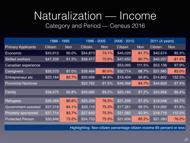 Haven’t done a similar analysis on Canadian participation and employment rates but income data shows similar pattern, but which reflects length of time in Canada. Similar pattern regarding eduction as well: