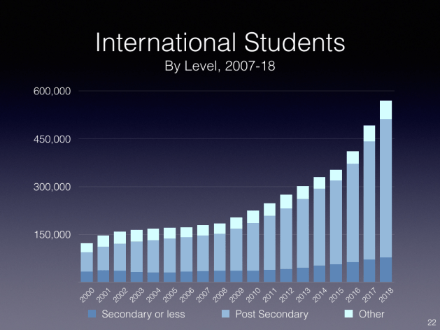 If Hussen’s announced new total is accurate, it means that since 2014, when 330,000 international students were in the country, the number has jumped by 391,000. And he is looking beyond China and India to bring in more to boost the GDP.