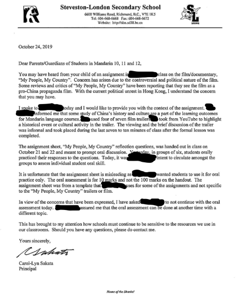 A copy of the principal’s letter with the teacher’s name redacted that was posted to the Canada Hong Konger Facebook page.