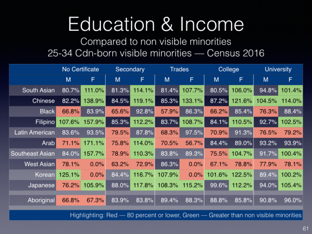 Ironically, when I analyse economic outcomes of visible minorities compared to not visible minorities, the gaps are larger between visible minority men and not visible minority men than is the case for women as the example looking at second generation 25-34 year olds below illustrates (similar pattern for first generation):