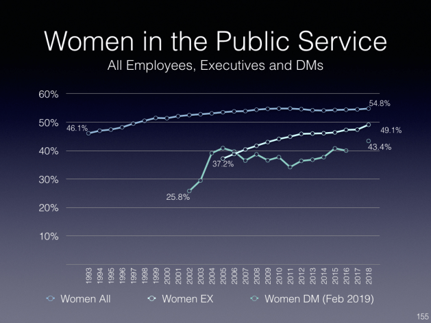The latest employment equity report shows a slight uptick in representation compared to the previous year of women EX (from 49.1 to 50.2 percent, visible minorities (all, from 15.7 to 16.7 percent and EX, from 10.1 to 11.1 percent) and Aboriginal (Indigenous) EX (from 3.7 to 4.1 percent).