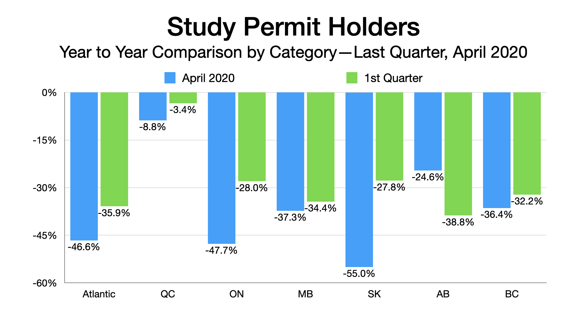 The three charts below highlight the extent of the decline starting in late 2019, along with the impact of the largest 10 source countries (2018 basis) contrasting the April 2020 change with the the first quarter of 2020.