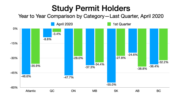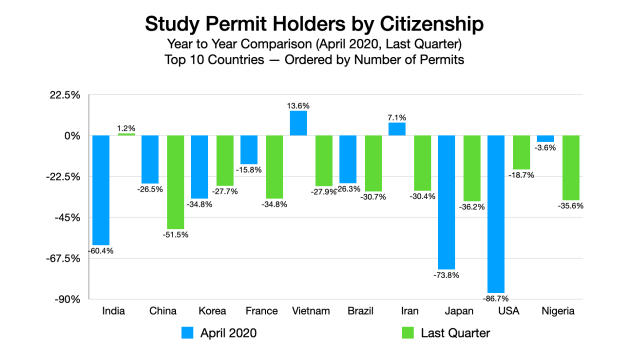 The latest Immigration Department figures show just 12,065 citizens of the People’s Republic of China obtained study visas in Canada in the first four months of 2020. That’s down 44 per cent from the same period last year. It’s more severe than the 31 per cent overall decline in study visas from all foreign students. Of the four other largest source countries sending students to Canada, the number of Indians has dropped by 29 per cent this year, South Koreans are down 35 per cent, French have declined 29 per cent and Vietnamese dipped 15 per cent.