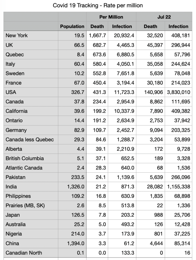 The latest weekly stats showing no major changes from last week in terms of relative ranking, although the USA can be expected to surpass the harder hit European countries in deaths per million over the next few weeks given current trends. The recent spike in infections in British Columbia, Alberta and Quebec continues to become more apparent (but not, fortunately to date, in the death statistics).California edged over Ontario this week: