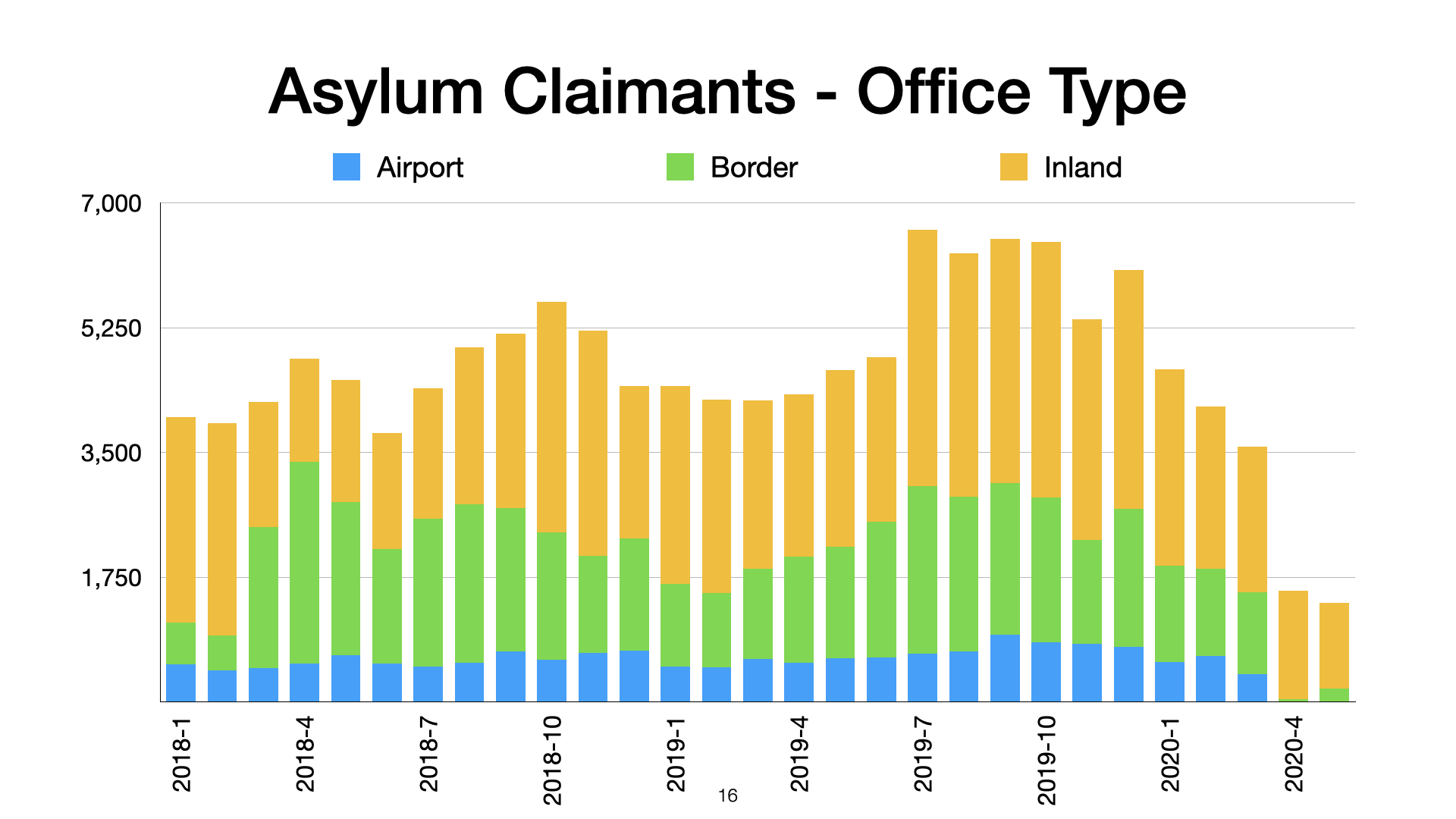 Current travel restrictions in place to slow the spread of COVID-19 appear to have placed downward pressure overall on asylum claims.