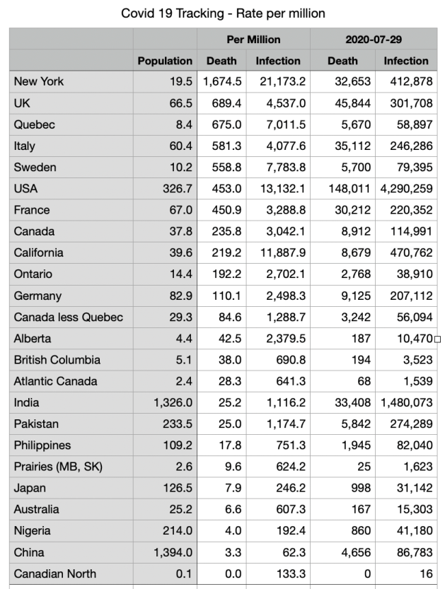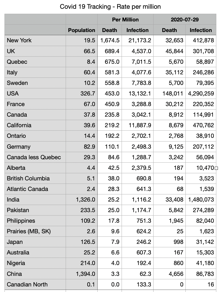 USA has moved ahead of France in terms of deaths per million. India has moved ahead of Pakistan. No major change in order of Canadian provinces.