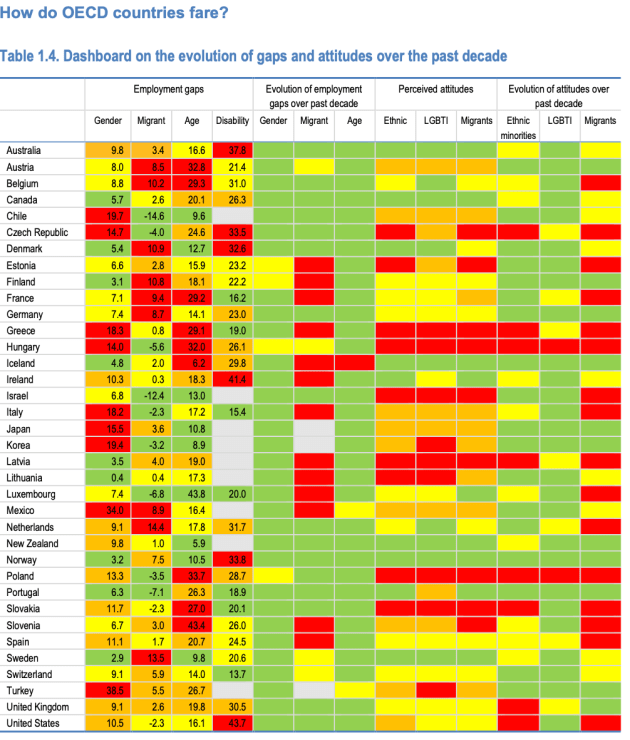 Note: The chart compares differences in employment rates of men and women; native-born and foreign-born; and prime-age (25-54) and older workers (55-64). Disability status is defined as self-perceived, long-standing activity limitations. Employment gaps and perceived attitudes are shown as colour-coded percentiles. Evolution over 10 years (2008 and 2018 for attitudes; 2006/07 and 2016/17 for labour market gaps): “red”: more than a 2 percentage points change to the favour of diverse groups, “yellow” between a +2 percentage points change and a -2 percentage points change, “red“: more than a 2 percentage points change to the detriment of diverse groups (regardless of statistical significance). The evolution refers to differences vis-à-vis the respective comparison group and not absolute values. “Grey”: data are not available.