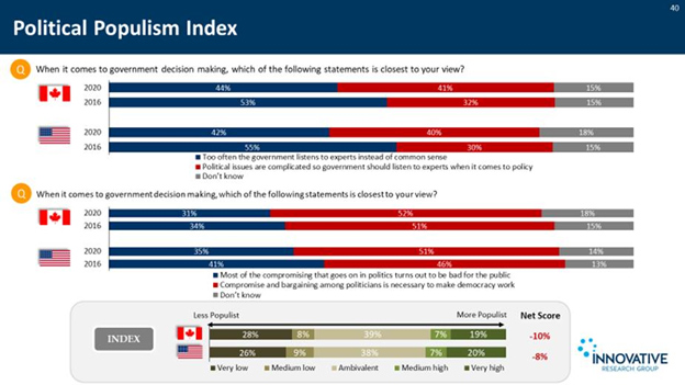 In a second slide, IRG reveals an important feature of our political culture. The slide uses a scale of 1 – 100 to assess how strongly Liberals, Conservatives, and NDP members feel about the role of experts in government decision-making. The poll finds a 24-point spread between Liberals and Conservatives, with the NDP in the middle. (See the line on Political Populism.)