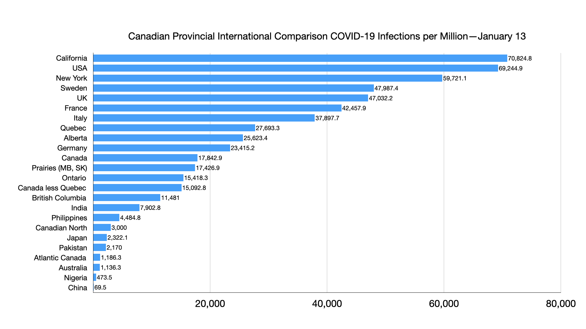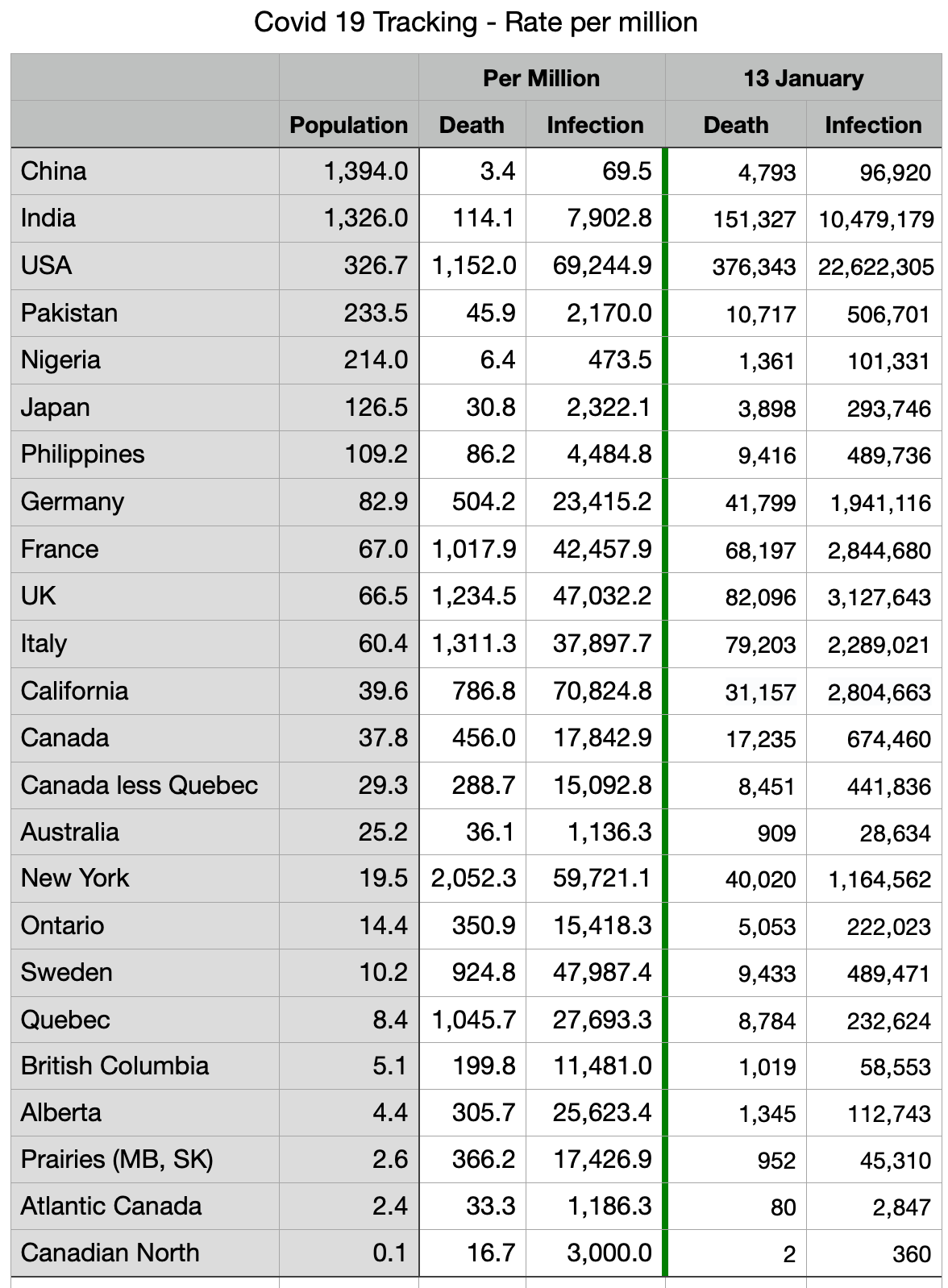 Infections per million: California ahead of USA, Ontario ahead of Canada less Quebec, Japan ahead of Pakistan, Atlantic Canada ahead of Australia