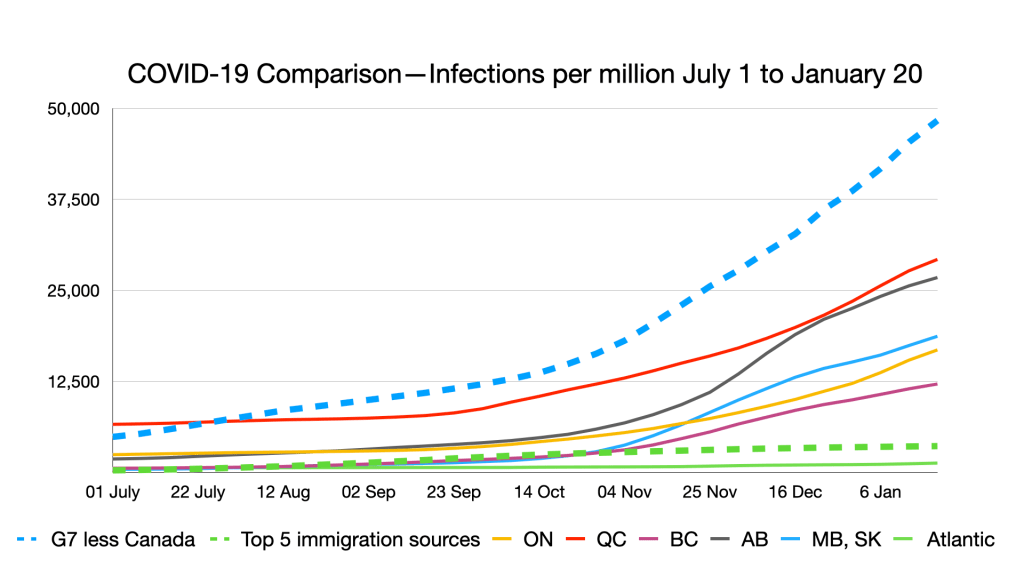 Infections per million: Alberta no longer appears to be overtaking Quebec but Ontario appears to be approaching Prairie rates.