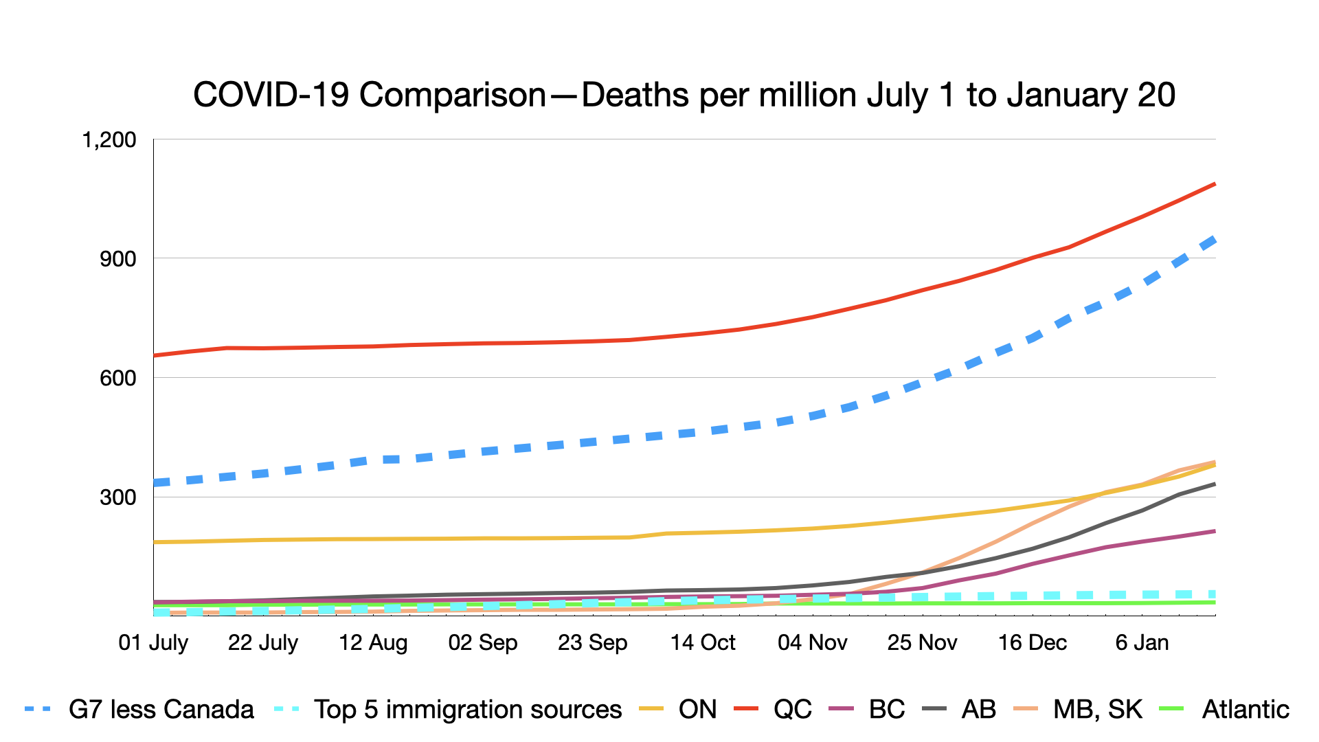 Infections per million: Alberta no longer appears to be overtaking Quebec but Ontario appears to be approaching Prairie rates.
