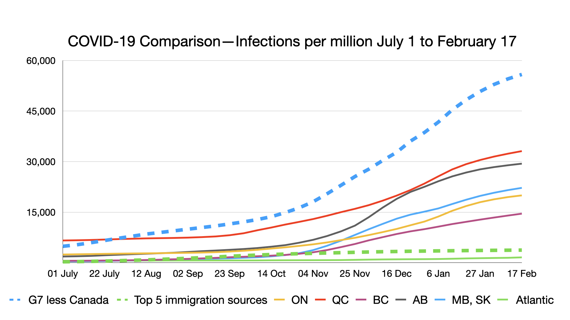 Infections per million: Alberta continues to be controlling the virus better than Quebec with an overall flattening of growth.