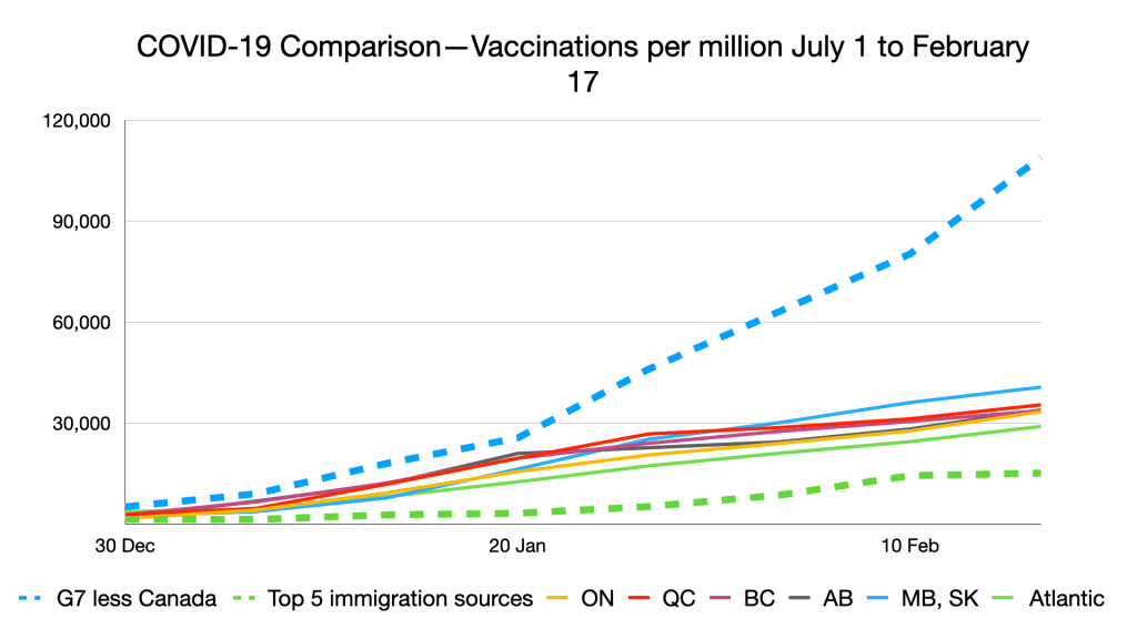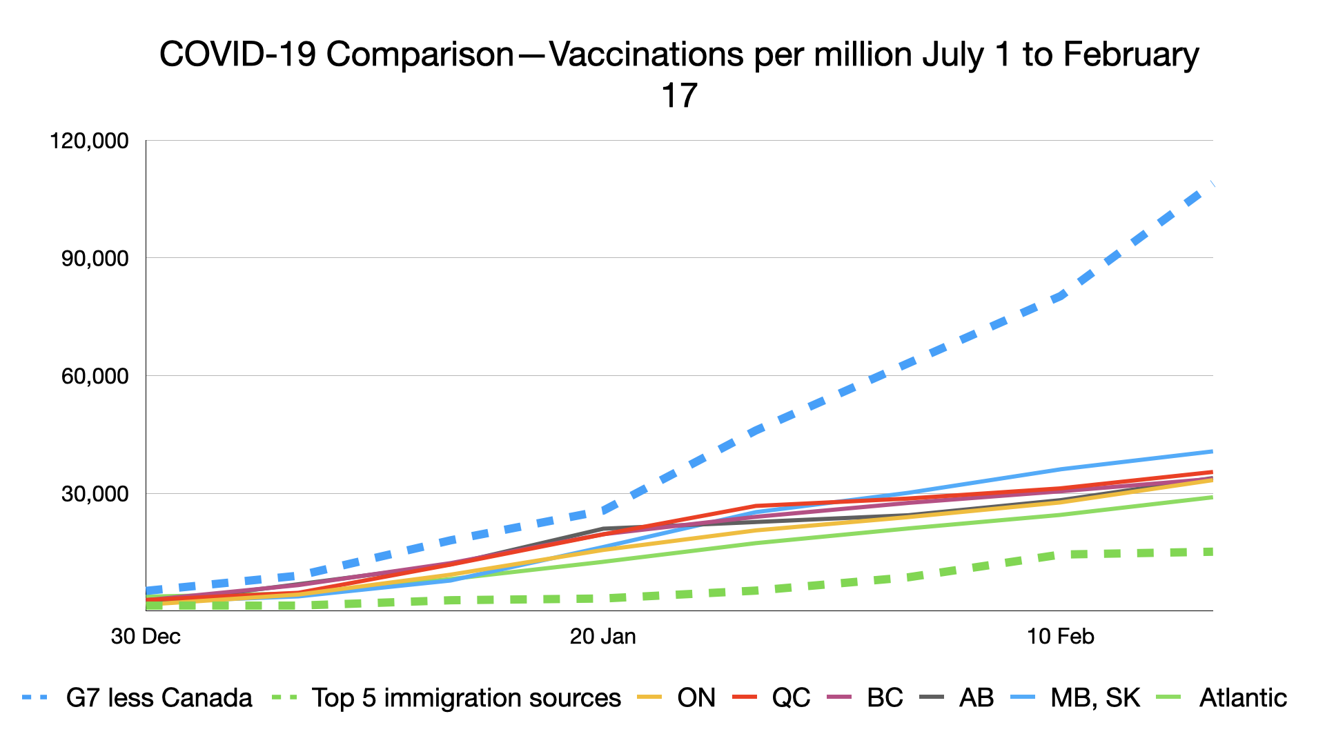 Vaccinations per million: Gap between G7 and Canada, driven not only by the UK and USA, continues to widen.
