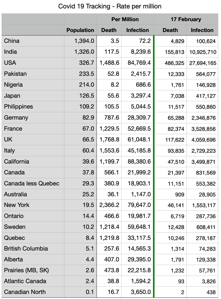 Deaths per million: Quebec ahead of France, Japan ahead of Pakistan.