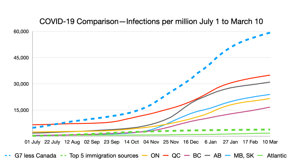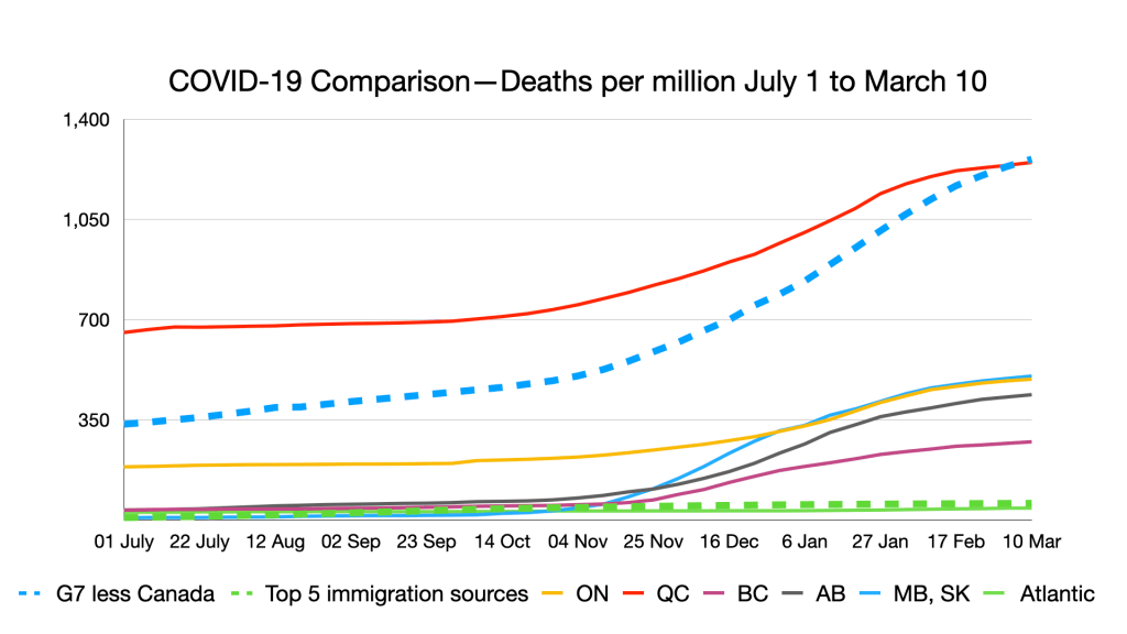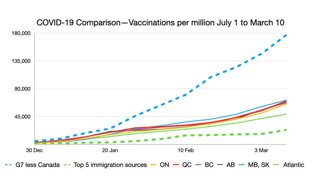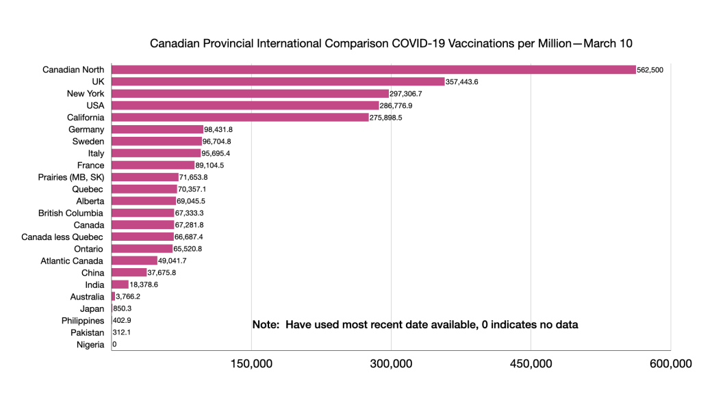 The latest charts, compiled 10 March (note international vaccination data is latest available). One year after the start of Canadian lockdowns.
