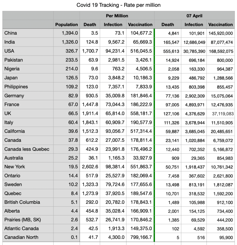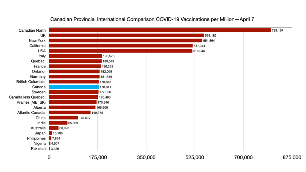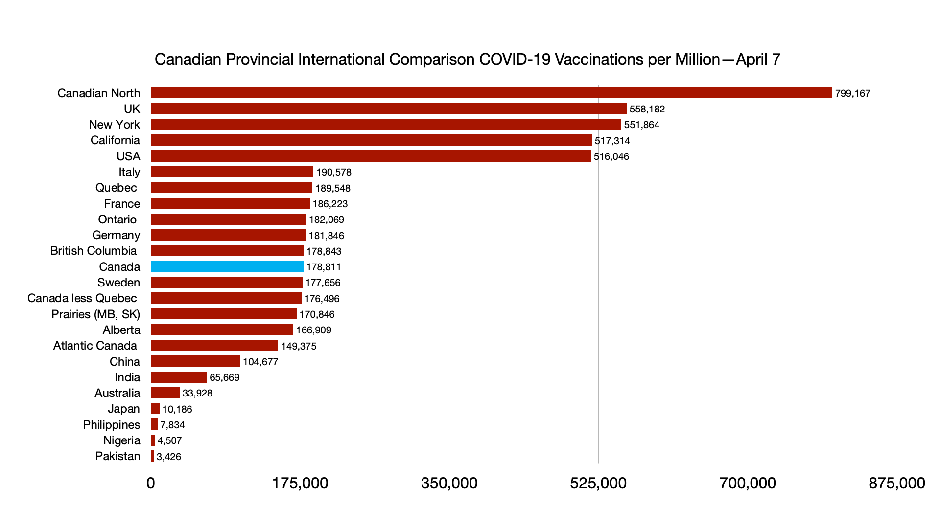 Vaccinations: Change from last week: Some Canadian provinces doing slightly better than EU countries. Quebec ahead of France, Ontario ahead of Germany, British Columbia and Canada ahead of Sweden, Prairies ahead of Alberta.