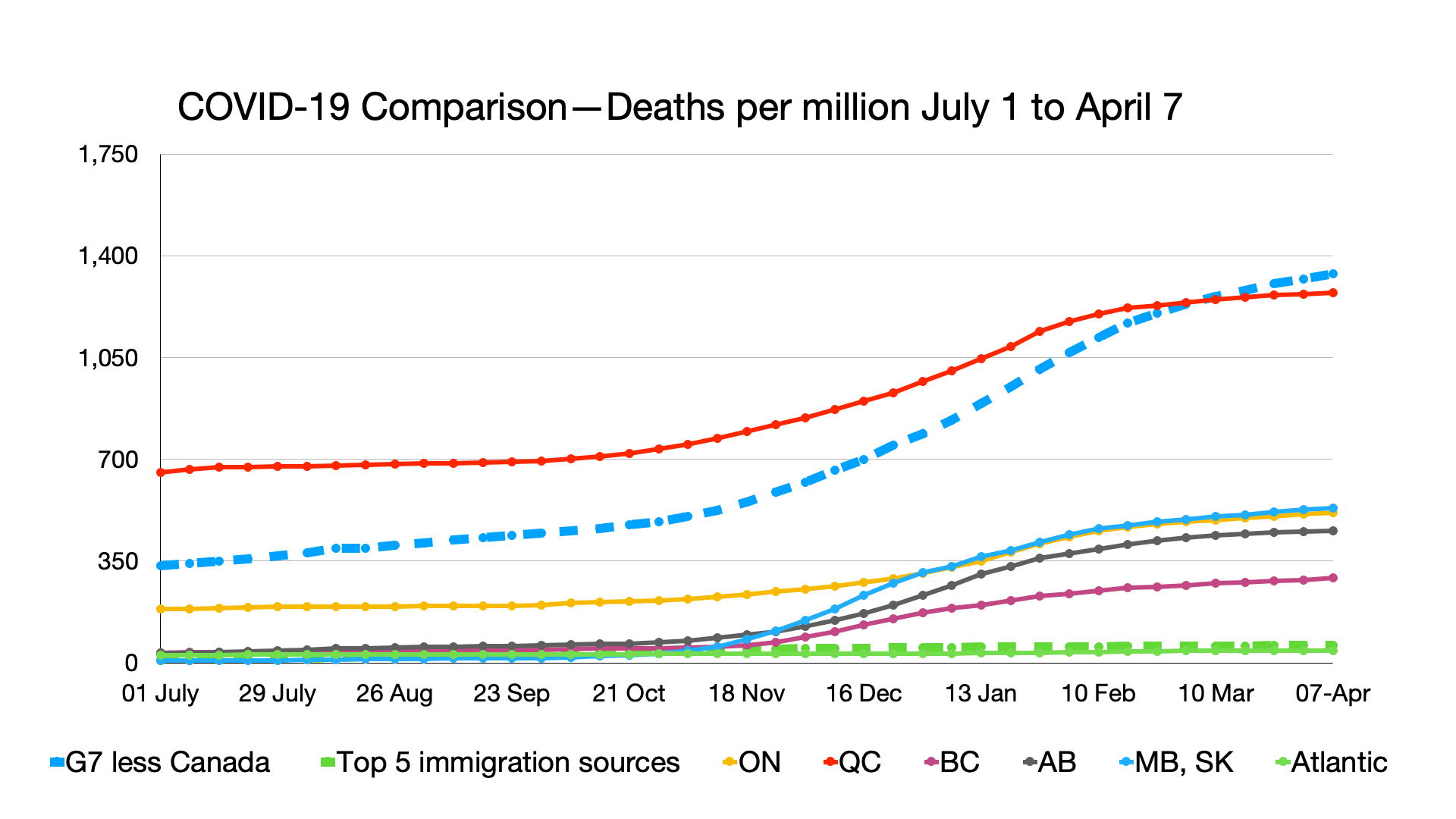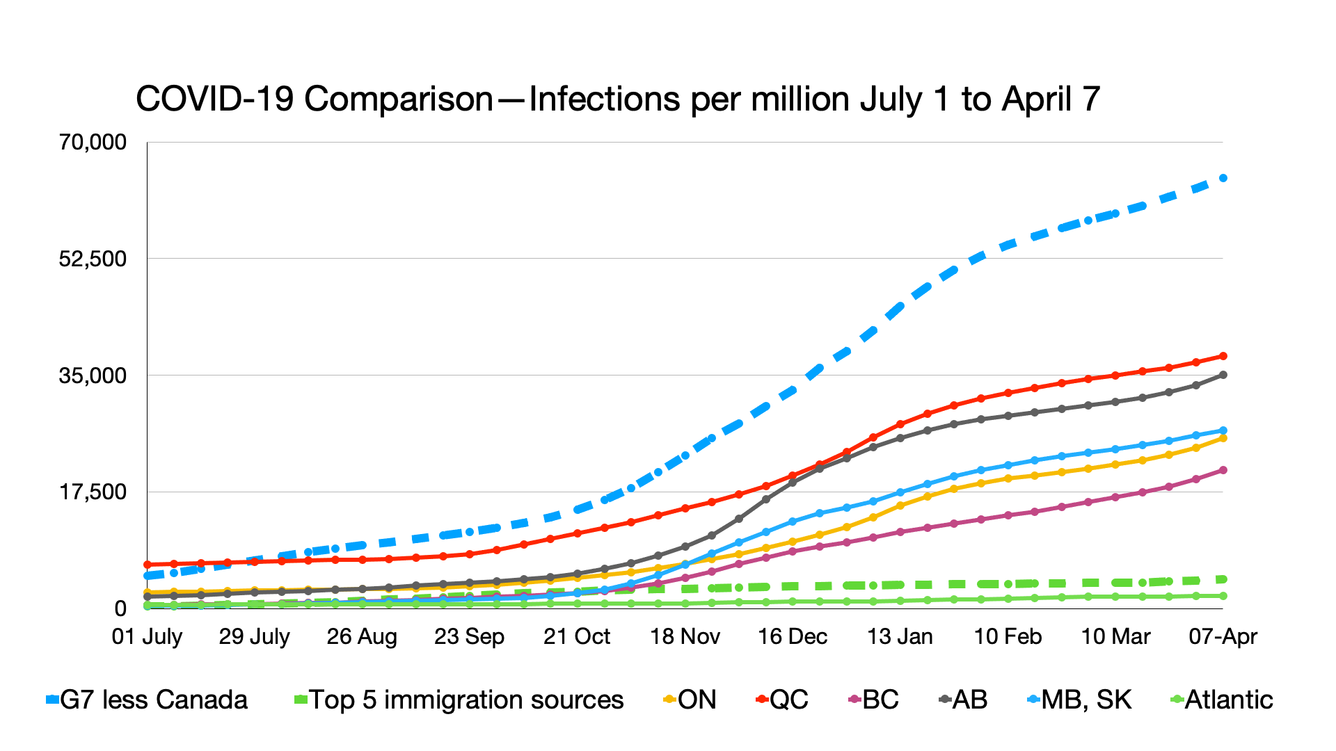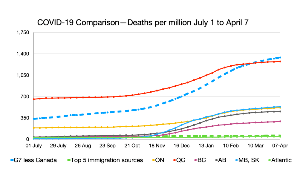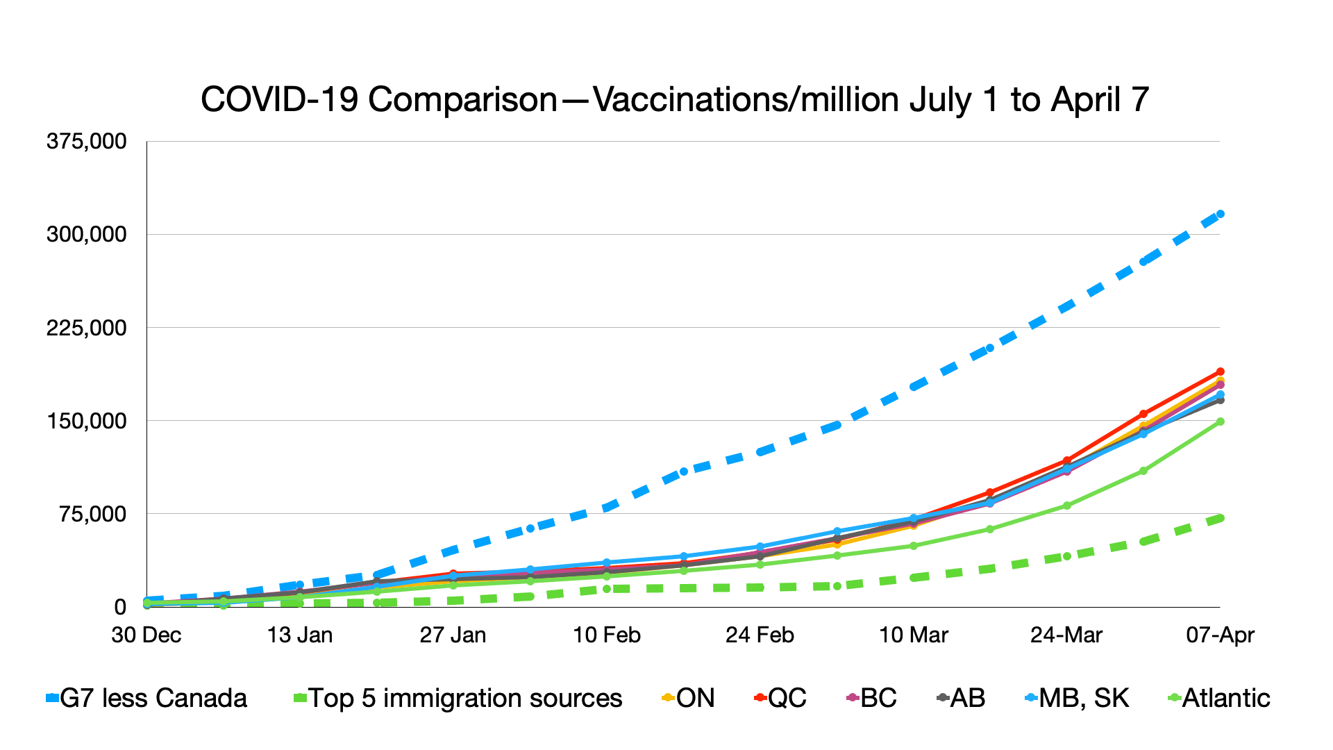 Vaccinations per million: While the gap between G7 and Canada remains, the rate has largely approached other G7 countries. Of note is the increase in vaccination rates of immigration source countries (China and India).