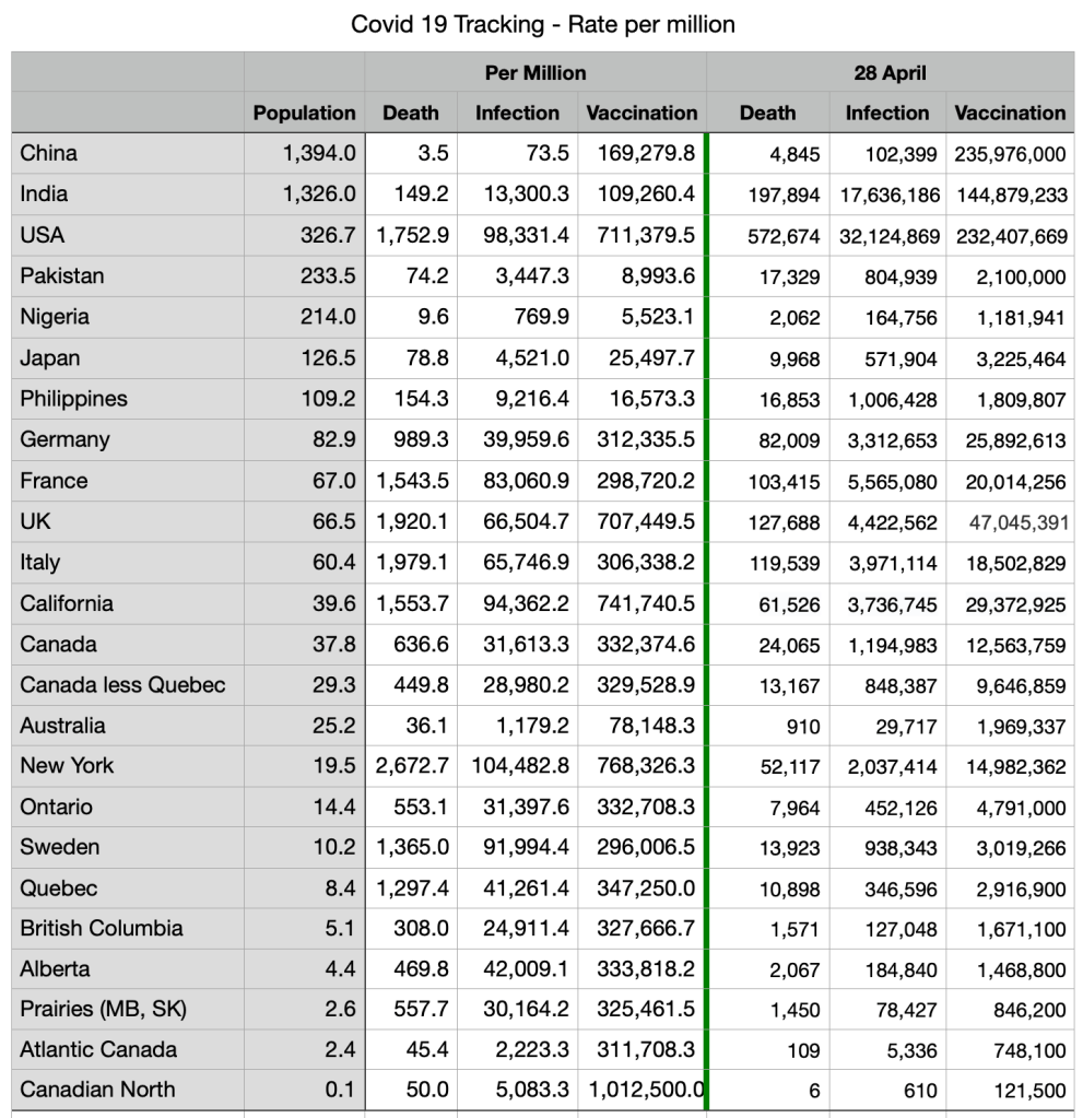The latest charts, compiled 28 April as the third wave has started. The spike of infections and deaths in India per million, although dramatic, has not resulted in a change in the relative ranking given the size of India’s population.