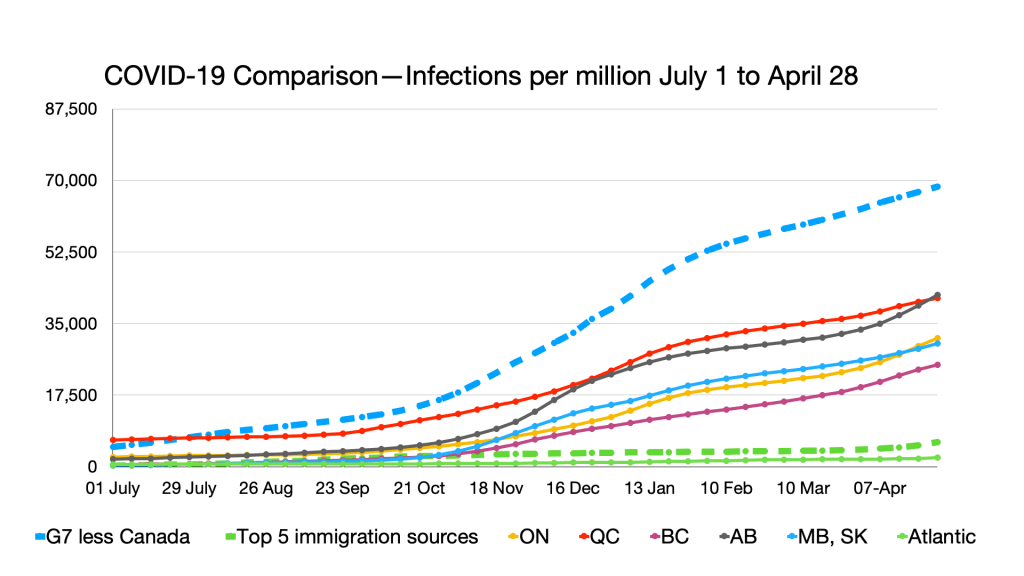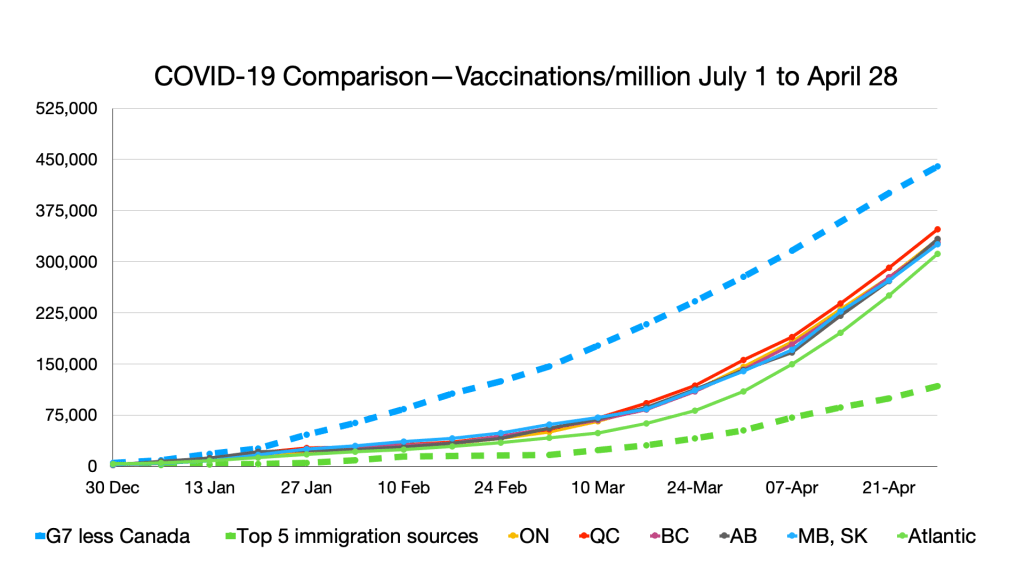 Vaccinations per million: Vaccination rates in Canadian provinces continue to increase more quickly than overall G7 less Canada countries. Increases among immigration source country reflect China and India mass vaccination roll-out.